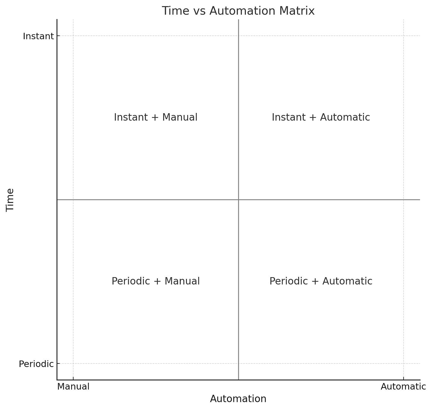 Instant and Manual (top left): Ok so nobody can have an instant manual response, but the closest is if you think about a security guard reacting in real-time to a visible incident. No automation, but high responsiveness.